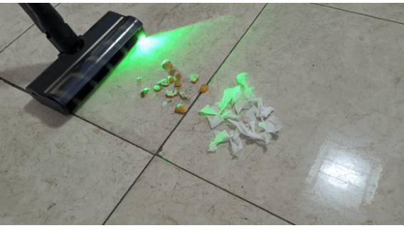 當(dāng)然只是能吸還不夠,要做到效率化清潔,自然還要更精準(zhǔn)。傳統(tǒng)吸塵器要么沒(méi)有照明,要么采用白光LED,這意味著要么清理昏暗區(qū)域時(shí)非常費(fèi)勁,要么只能看見(jiàn)大物體卻看不見(jiàn)灰塵。